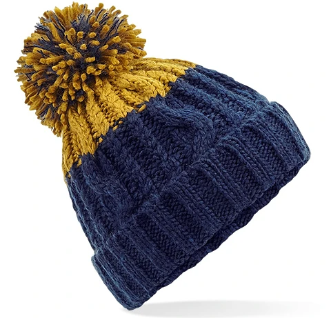 Merkmale TearAway-Label für einfaches Rebranding, schweres, mehrfädiges Zopfstrick-Design, kräftiges zweifarbiges Design, luxuriöser Pompon, luxuriöses Shearling-Thermoband für zusätzliche Wärme, Manschettendesign für optimale Dekoration