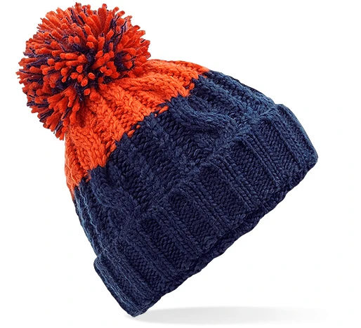 Merkmale TearAway-Label für einfaches Rebranding, schweres, mehrfädiges Zopfstrick-Design, kräftiges zweifarbiges Design, luxuriöser Pompon, luxuriöses Shearling-Thermoband für zusätzliche Wärme, Manschettendesign für optimale Dekoration