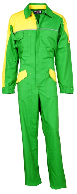 Zweifarbiger Arbeitsoverall mit Reißverschluss, elastischen Ärmelbündchen mit Knopf, zwei Vordertaschen mit LOCK SYSTEM und verstärktem Taschenboden, einer großen multifunktionalen Brusttasche, Smartphone-Tasche und Einsteckfach für den Ausweis, einer Gesäßtasche mit Patte und einer mit zwei Reflexstreifen, Reflexpaspelierung auf Brust und Hüfte, Gummizug auf Hüfthöhe und Doppelfalte auf dem Rücken für mehr Bewegungsfreiheit