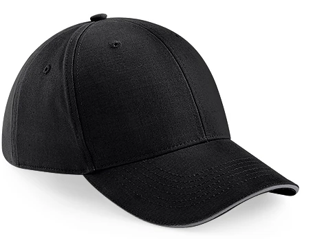 TearAway-Label für einfaches Rebranding, 6-Panel-Design, mittleres Profil, vorgekrümmter Schirm, Sandwich-Schirm in Kontrastfarbe, strukturierte Frontpanels, genähte Luftösen, selbes Gewebeband mit Tri-Glide-Schnalle