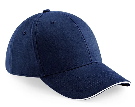 TearAway-Label für einfaches Rebranding, 6-Panel-Design, mittleres Profil, vorgekrümmter Schirm, Sandwich-Schirm in Kontrastfarbe, strukturierte Frontpanels, genähte Luftösen, selbes Gewebeband mit Tri-Glide-Schnalle