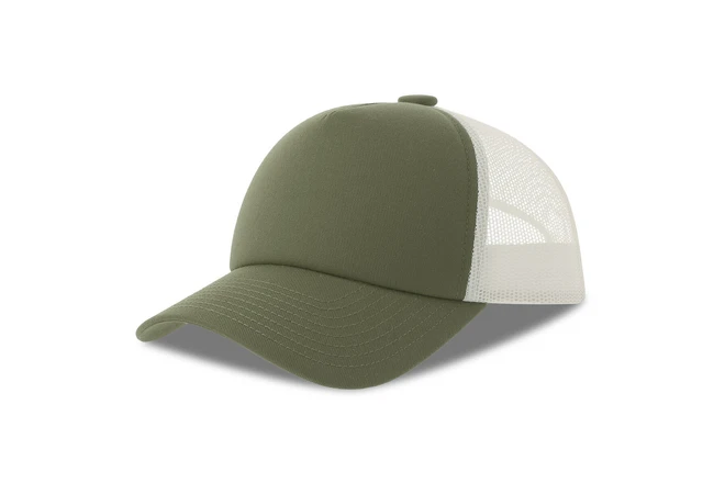 Ein Trucker-Hut, der dank seines gepolsterten Vorderteils und des übergroßen Knopfes zu einer Ikone der Streetwear geworden ist. Diese Kappe im urbanen Stil aus recyceltem Polyester mit Mesh-Anteil ist mit einem recycelten Snapback-Verschluss und einem recycelten ReTraze®-Schirm ausgestattet.
