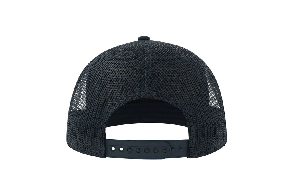 Flacher Schirm, PVC-Verschluss, Schweißband: 35 % Baumwolle / 65 % Polyester, Kontrastschirm, genähte Lüftungsschlitze, hinteres Netz, seitliches Netz, strukturiertes Frontpanel, 6 Nähte am Schirm.