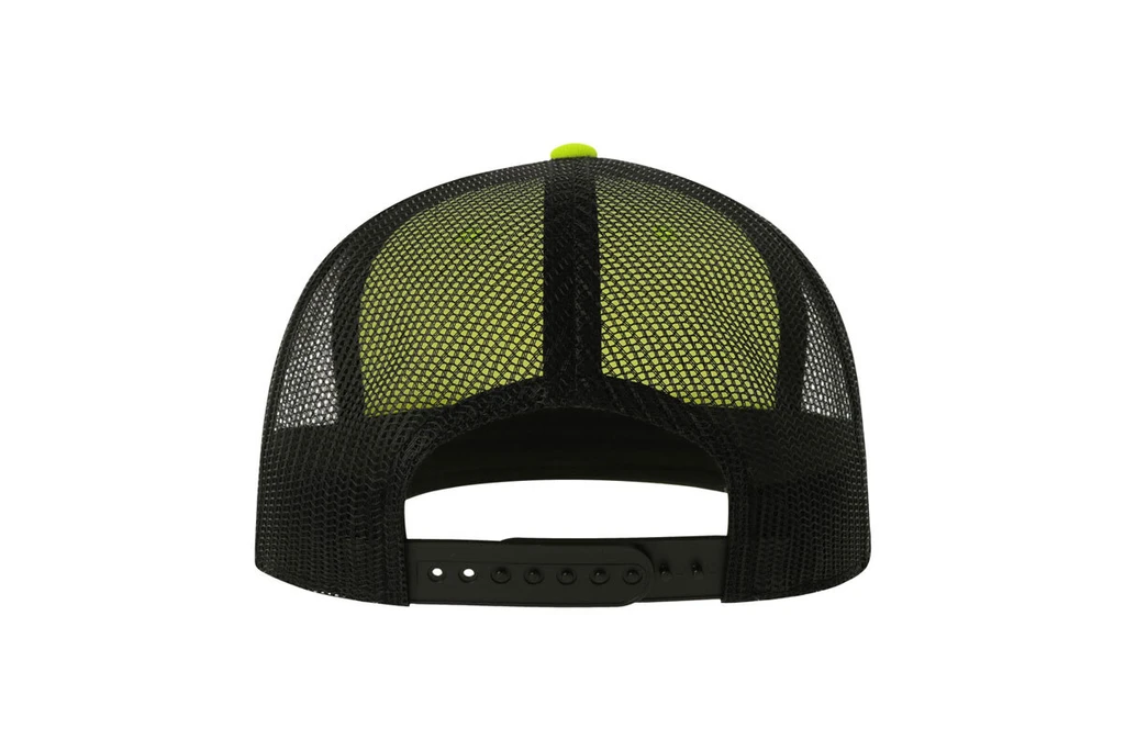 Flacher Schirm, PVC-Verschluss, Schweißband: 35 % Baumwolle / 65 % Polyester, Kontrastschirm, genähte Lüftungsschlitze, hinteres Netz, seitliches Netz, strukturiertes Frontpanel, 6 Nähte am Schirm.