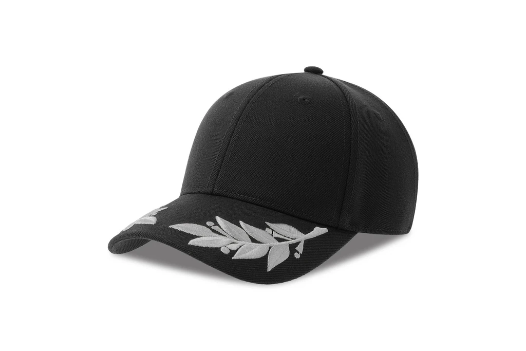 Eine Mütze aus recyceltem Polyester-Twill mit einem Schirm, der mit feierlichen Lorbeerblättern verziert ist. Sie ist das ideale Accessoire für Preisverleihungen oder als Werbegeschenk bei Wettbewerben. Der recycelte ReTraze®-Schirm und das Metallband mit Verschluss runden das Design ab.