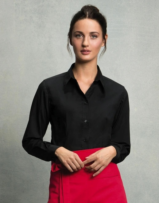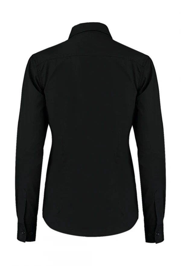 120 g/qm • 57% Baumwolle, 40% Polyester, 3% Elasthan • Pflegeleichte Langarm-Bluse • Leicht verstärkter Kragen • Ton-in-Ton Knöpfe • Abnäher auf Rücken und Vorderseite für taillierte Passform • Halbrunder Saumabschluss.