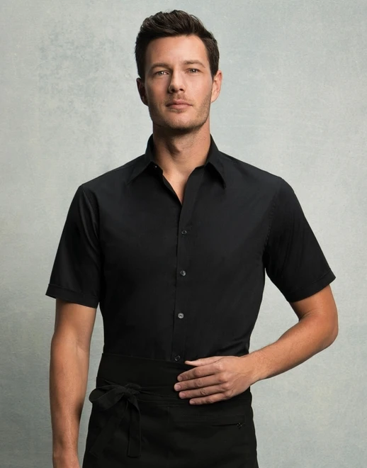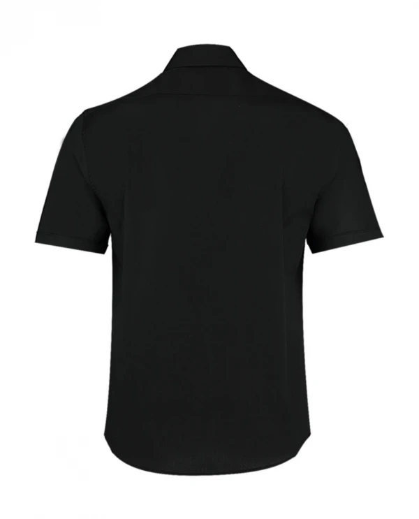 120 g/qm • 57% Baumwolle, 40% Polyester, 3% Elasthan • Pflegeleichtes Kurzarm-Hemd • Leicht verstärkter Kragen • Rückenpasse • Ton-in-Ton Knöpfe • Ärmelumschlag • Doppelsaum an Ärmeln und Seiten • Halbrunder Saumabschluss.