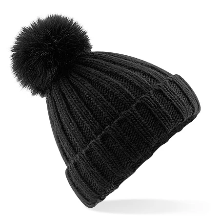TearAway-Label für einfaches Rebranding, luxuriöser einfarbiger Kunstpelz-Bommel, abnehmbarer Bommel für einfaches Waschen, Unisex-Styling, Bündchen-Design für optimale Dekoration, üppiger schwerer Rippstrick