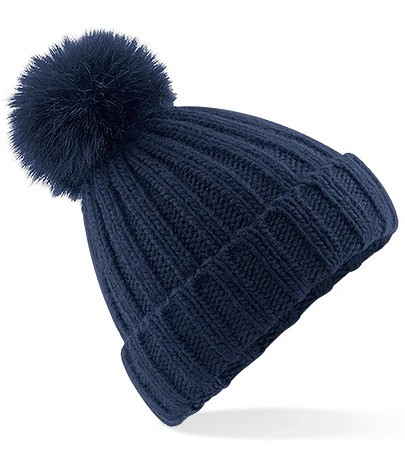 TearAway-Label für einfaches Rebranding, luxuriöser einfarbiger Kunstpelz-Bommel, abnehmbarer Bommel für einfaches Waschen, Unisex-Styling, Bündchen-Design für optimale Dekoration, üppiger schwerer Rippstrick