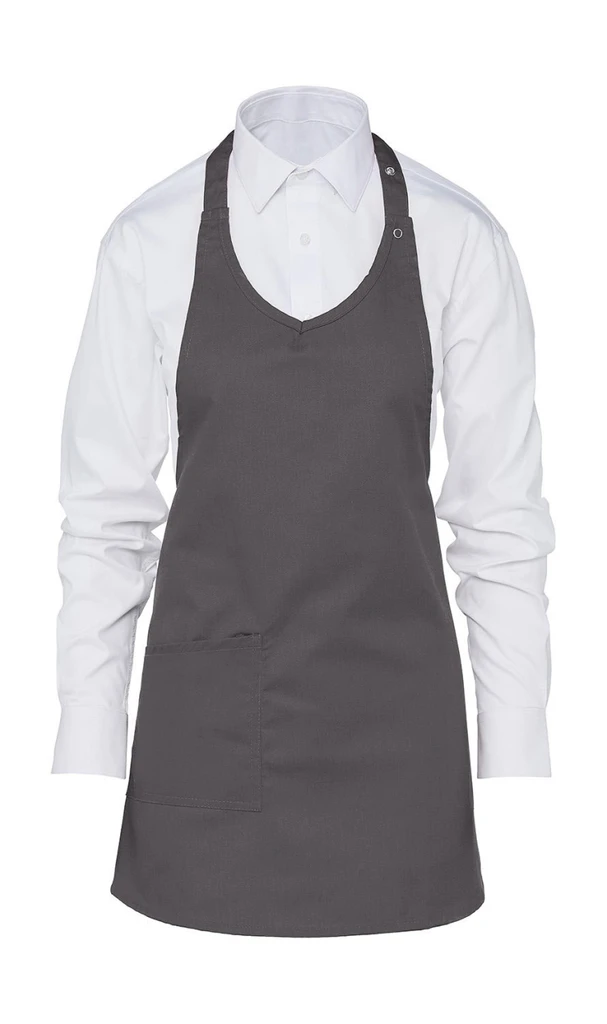 Diese bequeme kurze Latzschürze hat einen V-Ausschnitt mit verstellbarem Nackenband mit Druckknöpfen und ist dank der aufgesetzten Tasche, dem pflegeleichten Polyester-Baumwollstoff und der hervorragenden Waschbarkeit – 60° für alle Farben – schick und funktional. Es ist eine praktische und langlebige Wahl.