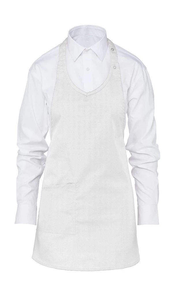 Diese bequeme kurze Latzschürze hat einen V-Ausschnitt mit verstellbarem Nackenband mit Druckknöpfen und ist dank der aufgesetzten Tasche, dem pflegeleichten Polyester-Baumwollstoff und der hervorragenden Waschbarkeit – 60° für alle Farben – schick und funktional. Es ist eine praktische und langlebige Wahl.