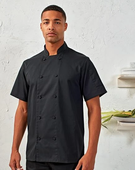 Eine kurzärmlige Kochjacke aus unserem eigenen Coolchecker®-Stoff. Die mittlere Rückwand besteht aus dem Coolchecker®-Gewebe, das außergewöhnliche Feuchtigkeitsregulierung und Dochtwirkungseigenschaften bietet, sodass der Koch während des Servierens frisch und kühl bleibt. Ein Wickelverschluss mit zehn Knöpfen aus demselben Stoff, ein Stehkragen und eine praktische doppelte Stifttasche am linken Arm.