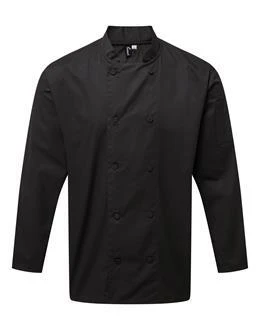 Eine langärmlige Kochjacke aus unserem eigenen Coolchecker®-Stoff. Die mittlere Rückwand besteht aus dem Coolchecker®-Gewebe, das außergewöhnliche Feuchtigkeitsregulierung und Dochtwirkungseigenschaften bietet, sodass der Koch während des Servierens frisch und kühl bleibt. Ein Wickelverschluss mit zehn Knöpfen aus demselben Stoff, ein Stehkragen und eine praktische doppelte Stifttasche am linken Arm.