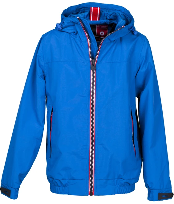Kinder-/Jugendjacke mit Kapuze, elastischem Bund, elastischen Ärmelbündchen und Gummilaschen zur Weitenregulierung, Reißverschluss in Kontrastfarbe, 2 Außentaschen mit verdecktem Reißverschluss; Innenseite nicht wattiert, Netzfutter, 1 Innentasche mit Reißverschluss und Öffnung für Smartphone-Kopfhörer, Reißverschluss am Bund zum einfacheren Veredeln mit Druck und Stick