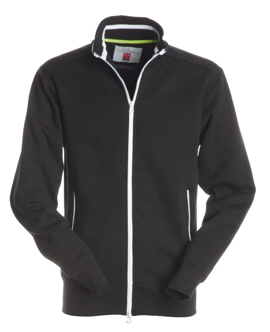 Kinder-Sweatjacke mit durchgehendem 2-Wege-SBS-Reißverschluss aus Kunststoff in Kontrastfarbe mit Metallschieber, kontrastfarbiger Einfassung auf dem Rippstrickkragen und auf den Seitentaschen, Kugelärmeln, zwei Außentaschen mit Reißverschlüssen in Kontrastfarbe, elastischem Feinripp an Ärmeln und Taille, verstärkten Nähten