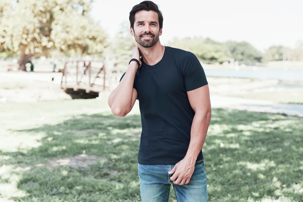 Material: 95 % ringgesponnene, gekämmte Baumwolle, 5 % Elastan; Single-Jersey „Full Feeder“ (GYH: 82% Baumwolle, 14% Viskose, 4% Elasthan); Gewicht: 170 g/m²; Ohne Etikett im Kragen, Single Jersey „Full Feeder“, verstärkte Schulternähte, Kragen aus gleichem Stoff, Nackenband in Kontrastfarbe, Seitennähte, kleines Größenetikett im Nacken, Pflegeetikett in der Seitennaht, waschbar bei 40°C; Zertifikat: STANDARD 100 by OEKO-TEX