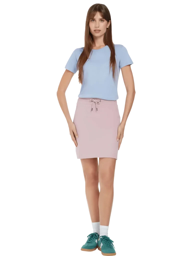 Der Rock ist mit einem gerippten, elastischen Bund und Kordelzügen mit Kugelspitzen für einen klaren, modernen Look ausgestattet und verfügt zudem über ein dezentes Seiteneinsatz-Detail, das die Form betont und gleichzeitig die minimalistische Ästhetik bewahrt.