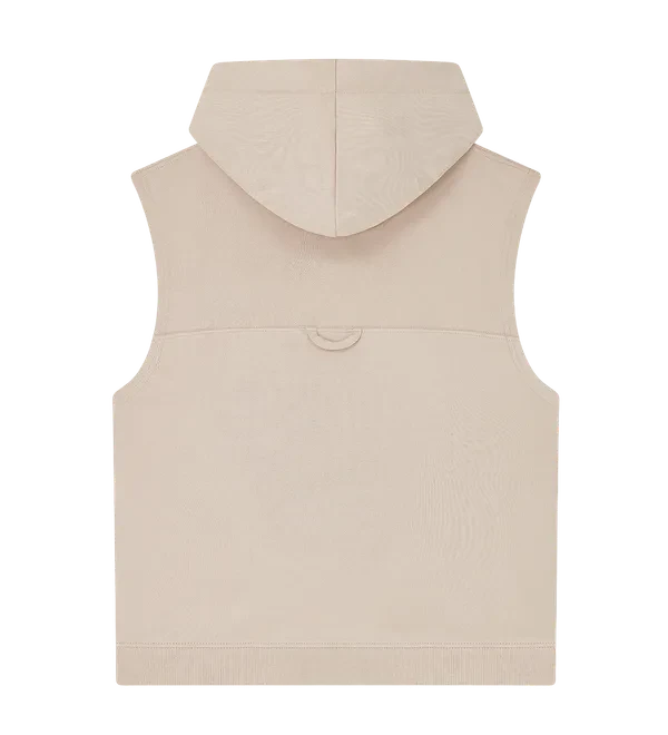 Der Stoff besteht aus 100 % Bio-Baumwolle und ist mit einer weichen, wildlederartigen Textur versehen, die für einen hochwertigen Griff und Komfort im Alltag sorgt. Zu den Design-Details gehören ein moderner, ärmelloser Schnitt, eine praktische Seitentasche und ein auffälliger Kordelzug, der dem Outfit den letzten Schliff verleiht.