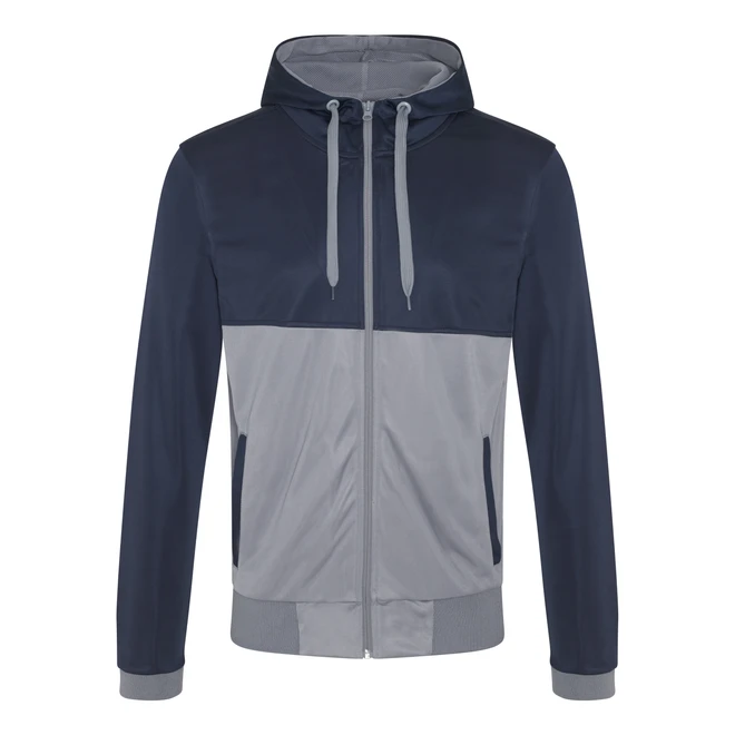Modern contrast panelling – top yoke, sleeves and hood are one colour, and bottom half of body, cuffs, hem, draw cords and hood mesh are contrast colour.