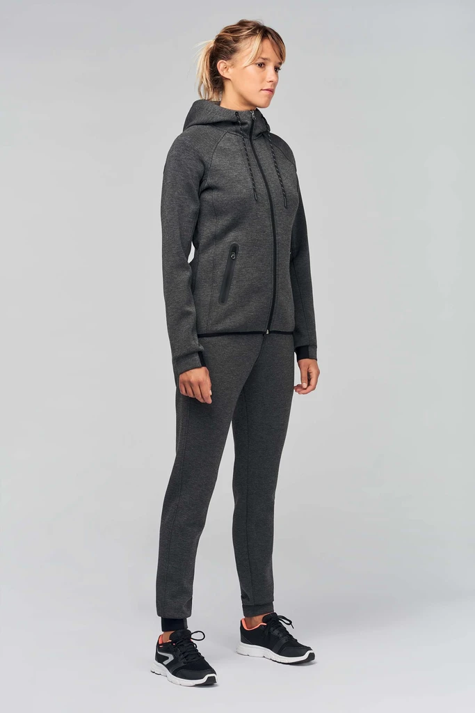 79 % Polyester / 15 % Viskose / 6 % Elasthan. Besonders bequemes Material. Reißverschluss. 2 geschweißte Reißverschlusstaschen vorne. Kapuze mit Jerseyfutter aus 65 % Polyester / 35 % Baumwolle mit zweifarbigem Kordelzug mit plastikverstärkten Enden. Schmale Ärmelbündchen mit kontrastfarbenem Elastikeinsatz. Kontrastfarbenes Schrägband am Saum.