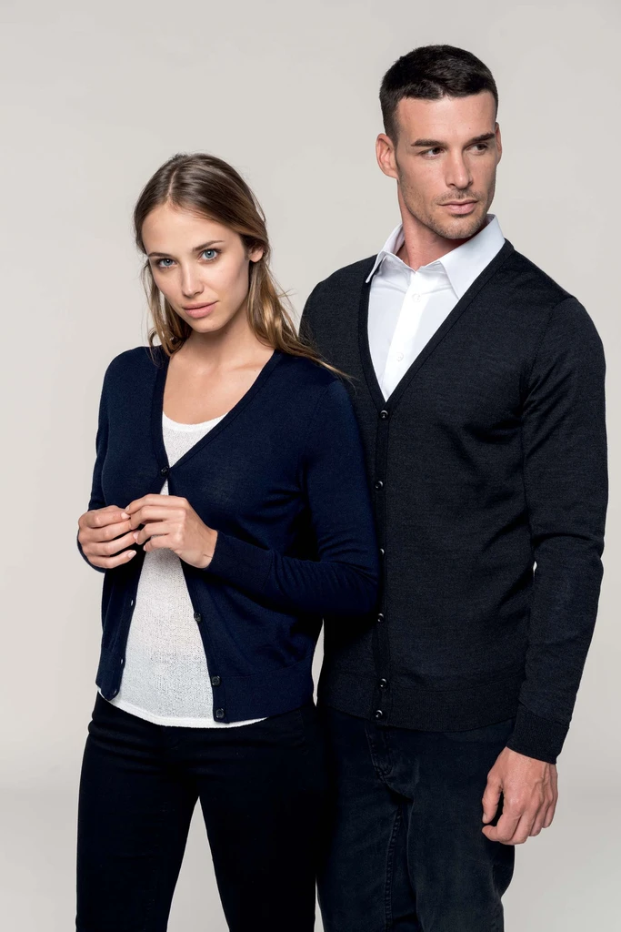 100 % besonders feine, vorgeschrumpfte Merinowolle. Besondere Behandlung für eine noch weichere Textur. Warmes Material mit hohem Tragekomfort. V-Ausschnitt und farblich abgestimmte Knöpfe. Doppelte 1x1-Strickbündchen am Halsausschnitt und der Knopfleiste vorne, einfache Bündchen an Ärmeln und Saum.