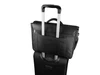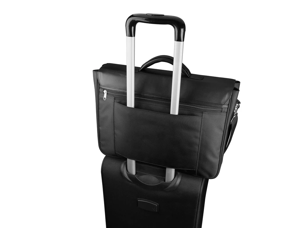 Dokumenten-/Laptop-Tasche aus 840D Polyester mit Klappe aus PU-Lederimitat. 2 Fronttaschen, 2 Innenfächer mit Steppeinsatz zum Verstauen eines 15"-Laptops. Halterung zur Befestigung an der Rückseite des Trolleys. Zum Trolley KI0822 passendes Modell.