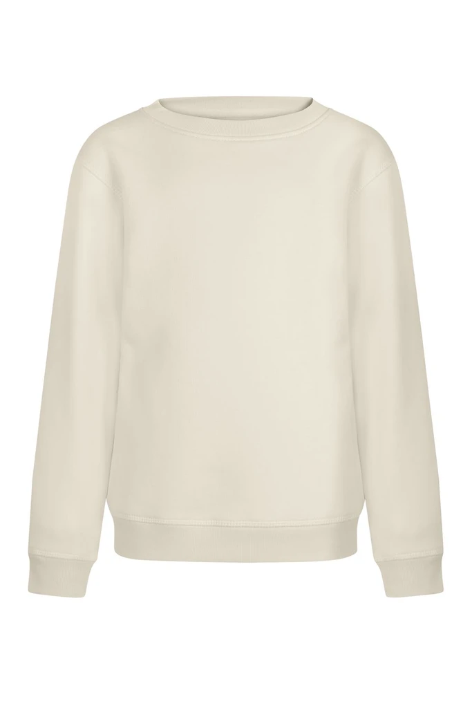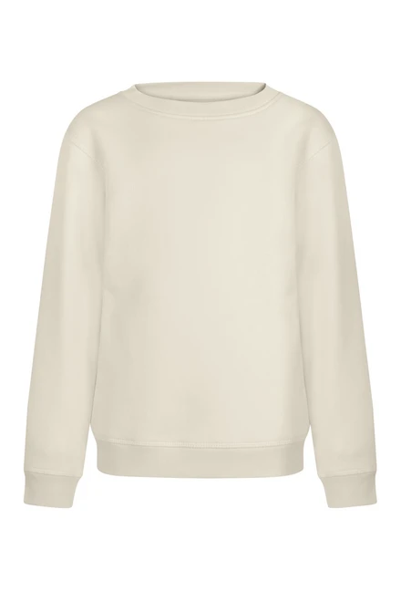 KINDER Sweatshirt mit Rundhalsausschnitt. Gebürsteter Fleece. 85 % Bio-Baumwolle (RingSpun) – 15 % recyceltes Polyester. 300 g/m². Gebürsteter Fleece, weich, bequem und warm. Formbeständiger Kragen, Bund und Ärmelbündchen aus geripptem Strickstoff 1x1. Verstärktes Innenband im Nacken mit Fischgrätenmuster. Kein Markenlabel im Nacken. Unisex-Größen: DUNE Damengrößen: DUNE WOMAN