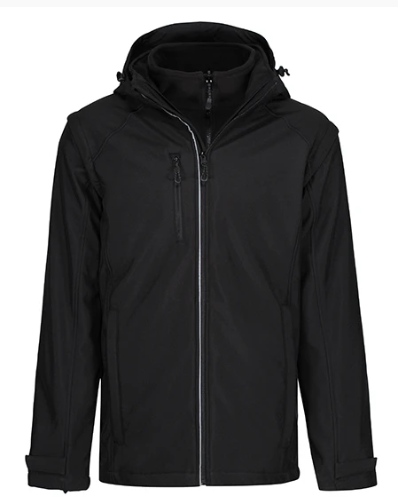 Warm unterlegtes gewebtes Softshell XPT wasserdichtes und atmungsaktives 3-Lagen-Membrangewebe, abnehmbare Kapuze mit Verstellmöglichkeiten, abzippbare Ärmel, 2 RV-Unter- und 1 RV-Brusttasche, verstellbare Ärmelbündchen, reflektierende Details für bessere Sichtbarkeit, Fleece-Innenjacke: 220 g/m², 100 % Polyester (220 Serie Antipilling Symmetry Fleece), durchgehender Reißverschluss, Seitentaschen