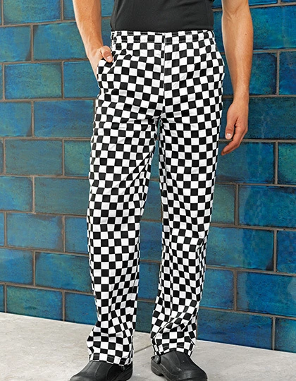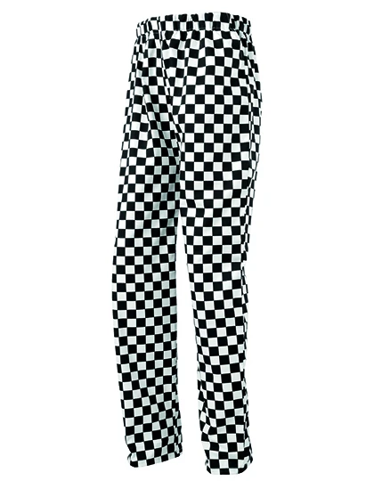 Praktische Kochhose in Schlupfform, erhältlich in beliebten Streifen- und Karomustern. Die Ziehkordel im elastischen Bund sorgt für einen besonders sicheren, gut anliegenden Sitz an der Taille. Zudem hat die Hose zwei praktische, seitliche Eingrifftaschen.