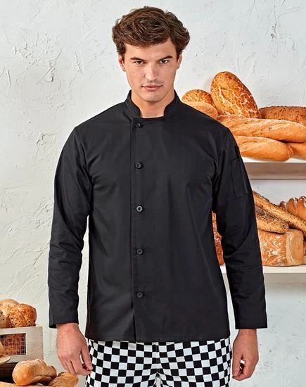 Eine strapazierfähige Kochjacke mit langen Ärmeln, die an der rechten Körperseite mit fünf langlebigen Harzknöpfen befestigt wird. Am oberen linken Ärmel befindet sich ein praktisches Doppelfach für Stifte. Diese Jacke hat einen Stehkragen, ist in Schwarz und Weiß erhältlich und bietet ein hervorragendes Preis-Leistungs-Verhältnis.
