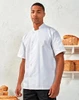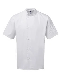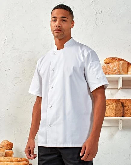 Eine strapazierfähige Kochjacke mit kurzen Ärmeln, die an der rechten Körperseite mit fünf langlebigen Harzknöpfen befestigt wird. Am oberen linken Ärmel befindet sich ein praktisches Doppelfach für Stifte. Diese Jacke hat einen Stehkragen, ist in Schwarz und Weiß erhältlich und bietet ein hervorragendes Preis-Leistungs-Verhältnis.
