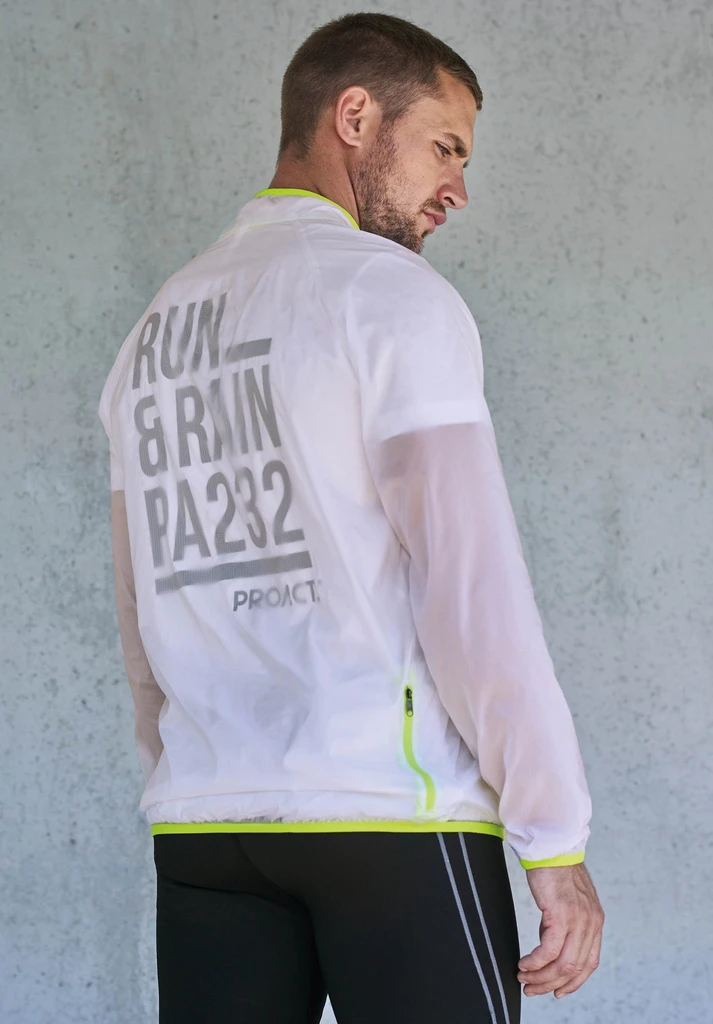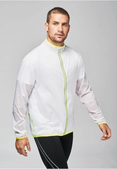 100 % Ripstop-Polyamid. Extraleichtes, schnelltrocknendes Gewebe. Raglanärmel. Fluoreszierendes elastisches Schrägband an Kragen, Ärmelbündchen und Saum. Frontreißverschluss mit reflektierendem Streifen. 1 Reißverschlusstasche an der Seite zum Verstauen des Blousons (K-way®-System mit Aufhänger).