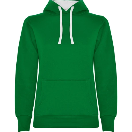 Tailliertes Damen Kapuzensweat. Kapuzenfutter, Kordelzug und Metalösen in Kontrastfarbe. Nackenband mit Fischgrätmuster. Kängurutasche. Ärmelbündchen und Saum mit 1x1 Rippstrick und Elasthan. Ärmelbündchen mit Daumenöffnung.