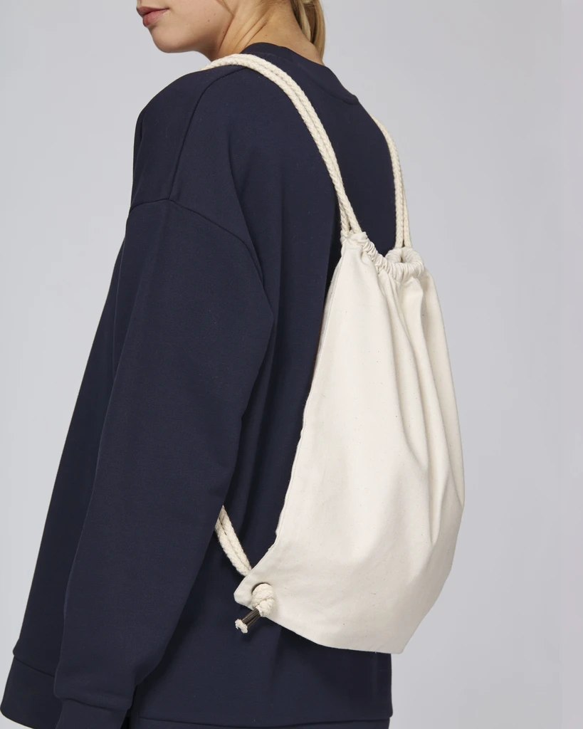 Gewicht: 300 g/m²; Material: CANVAS - 80% RECYCELTER BAUMWOLLE, 20% RECYCELTES POLYESTER; Hochwertige und robuste Verarbeitung des Tunnels für die Kordel, Verstärkungen am Tunnel für die Kordel, Dicke Kordel mit geknoteten Enden, Ösen und Kordelenden aus bronzefarbenem Metall, Dreieckige Verstärkungen an den unteren Ecken; Größe: 37 x 43 cm; Certificates: Global Recycled Standard, FAIR WEAR, PeTA - Approved VEGAN