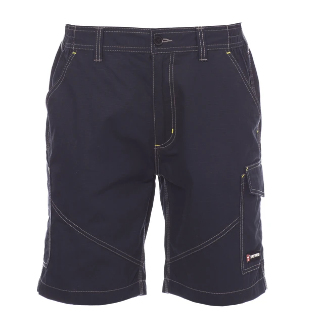 Herren Bermudashorts, seitliche Gummi- und Hüftgurtschlaufen, Reißverschluss mit Kunststoffknopf, zwei klassische Fronttaschen, eine Seitentasche mit LOCK SYSTEM, eine Maßbandtasche, zwei Gesäßtaschen, eine mit Klappe und eine mit Klettverschluss, Kontrasteinsätze und Nähte, reflektierende Streifen auf der Gesäßtasche, dreifache Nähte
