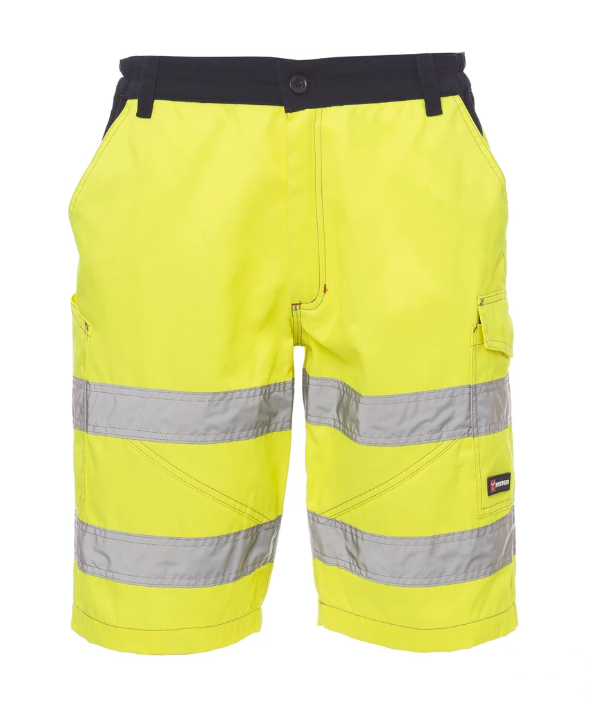 Herren Bermudashorts, hohe Sichtbarkeit mit reflektierenden Streifen, seitliche Gummizüge und Gürtelschlaufen, Reißverschluss mit Kunststoffknopf, zwei klassische Fronttaschen, eine Seitentasche mit LOCK SYSTEM, eine Maßbandtasche, zwei Gesäßtaschen, eine mit Patte und eine offene mit Klettverschluss. Kontrastierende Dreifachnähte im Schritt und im Bein