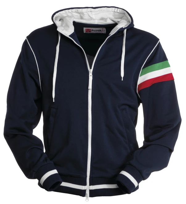 Kunststoffreißverschluss mit Doppel-Metall-Zug. Kontrastierende Kapuze und Tunnelzug, kontrastierende Stretch-Rippbündchen und -saum, kontrastierende Bündchen, Ziernähte (Farben der Flagge) auf dem linken Ärmel, 2 Taschen mit Reißverschluss, verstärkte Nähte und Pique-Gewebe für mehr Atmungsaktivität