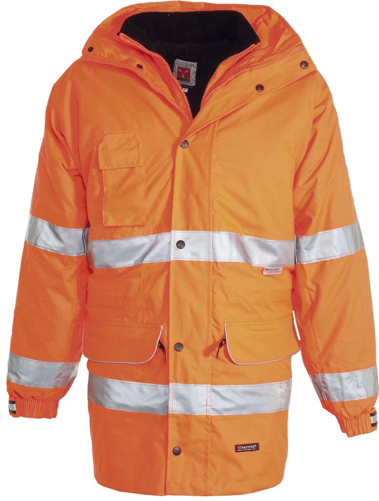Gut sichtbarer Herren-Parka 4-in-1 mit 3M-Streifen: nicht wattierte Außenjacke mit verdecktem Reißverschluss aus Kunststoff mit Metallschieber und Knöpfen, vorgeformter, im Kragen einrollbarer Kapuze mit Kordelzug,