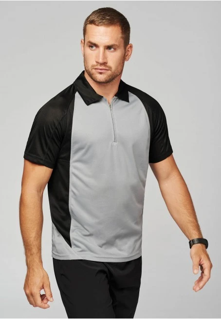 100% Polyester. Ultraleicht und schnelltrocknend. Polokragen mit Nylon-Reißverschluß und Paspeln. Raglanärmel in Kontrastfarbe. Stoffüberlappungen an Ärmeln. Doppelnahtverarbeitung am unteren Ende, an den Ärmeln, am Halsausschnitt.