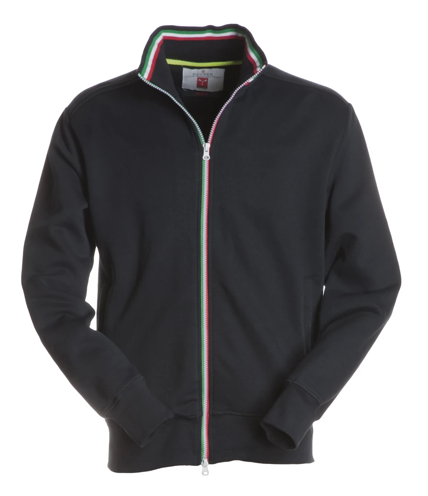 Herren Sweatshirt mit komplettem, kontrastierendem, dreifarbigem SBS-Kunststoffreißverschluss mit Doppel-Metall-Zug, Rippkragen mit kontrastierendem Rand, eng anliegende Ärmel, zwei Außentaschen, Stretch-Rippbündchen und -saum, verstärkte Nähte