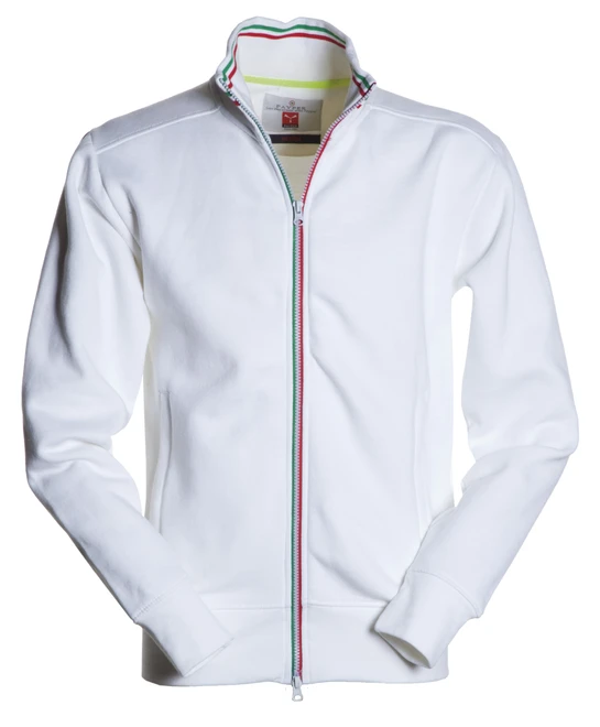 Herren Sweatshirt mit komplettem, kontrastierendem, dreifarbigem SBS-Kunststoffreißverschluss mit Doppel-Metall-Zug, Rippkragen mit kontrastierendem Rand, eng anliegende Ärmel, zwei Außentaschen, Stretch-Rippbündchen und -saum, verstärkte Nähte