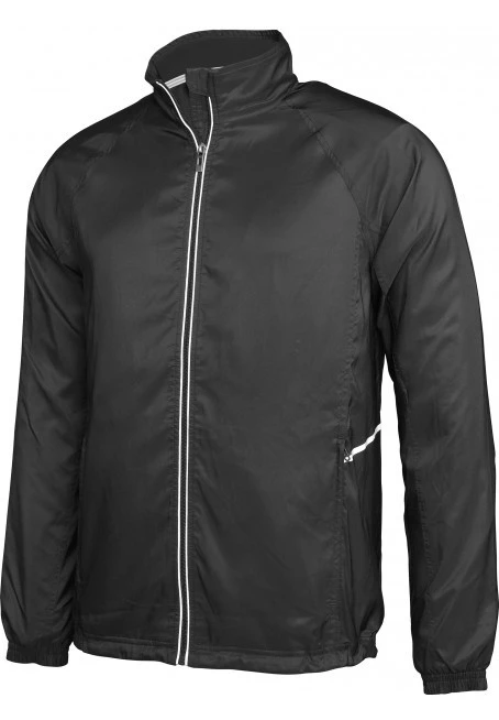 100% Diamant-Polyester. Schnelltrocknendes Netzfutter. Reißverschluß mit reflektierender Paspel. 2 Fronttaschen mit Reißverschluß. 1 Innentasche. Elastisch am Handgelenk. Bund mit Kordelzug und Stopper. Reflektierendes Band seitlich. Reißverschluß für leichtes Veredeln.
