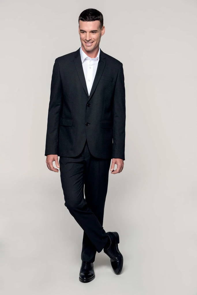 64 % Polyester / 34 % Viskose / 2 % Elasthan. Futter: 100 % Polyester-Taft. Jacke mit 2 Knöpfen. 2 Paspeltaschen mit Klappe vorne. 1 Brusttasche. 2 Innentaschen mit Knopf und 1 Handytasche. Ärmelbündchen mit 4 Knöpfen. 2 Schlitze am Rücken. 1 unsichtbarer Reißverschluss an der linken Seite zur Veredelung.