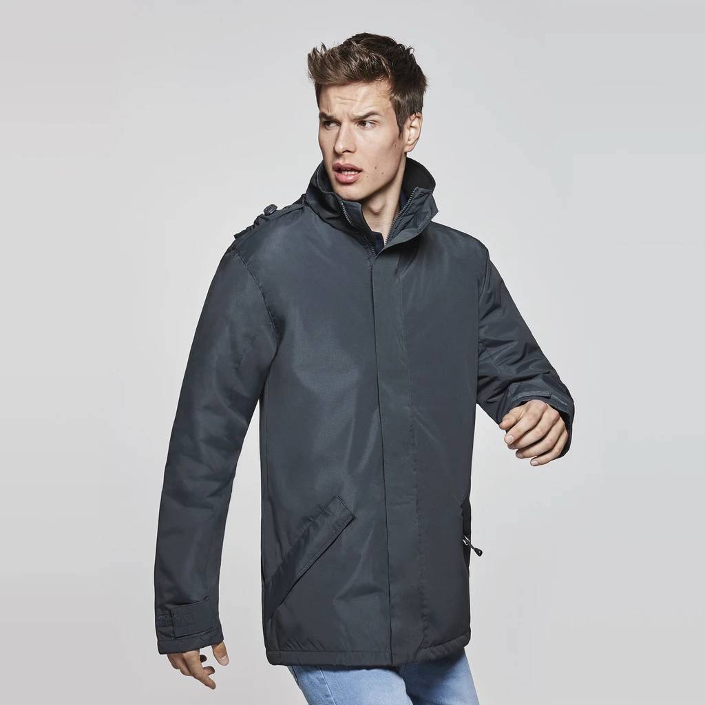 Parka mit hohem Kragen, Reißverschluss, Windblende und Klett.