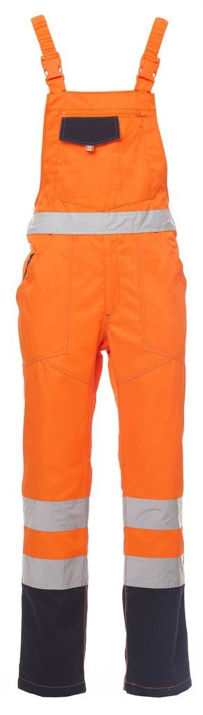 Warnschutz-Latz mit reflektierenden Streifen und umfangreichem Nierenschutz, elastische Hosenträger und Schnalle mit Druckknopfverschluss, seitliche Öffnung mit Knöpfen, elastische Taille hinten. Dreifache Nähte im Schritt und im Bein. Doppelte Brusttasche, eine mit Reißverschluss und Hakenring für ID-Halter, eine mit Klappe und eine Stifttasche. Zwei große Fronttaschen, eine mit Münztasche, eine geschlossene Rückentasche mit Klappe und eine rechte Maßbandtasche