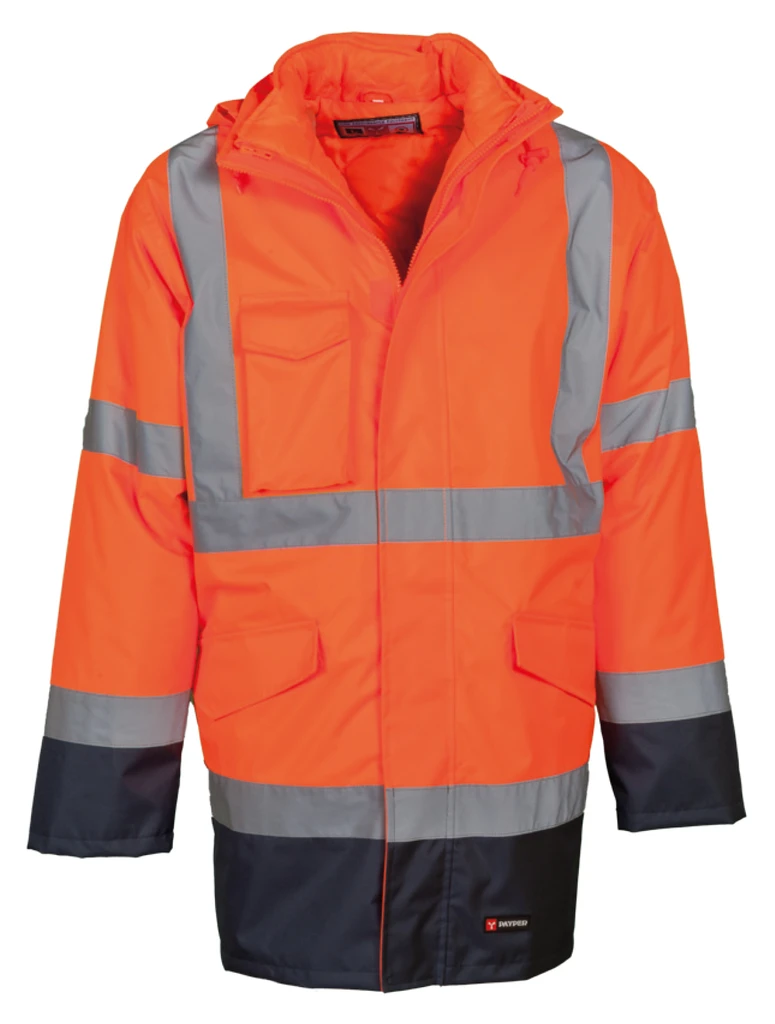 Zweifarbiger Warnschutzparka Drei-in-Eins mit verschweißten Nähten; Außenteil: ungefüttert, mit durchgehendem, verdecktem Reißverschluss und Reflexstreifen, Einsteckkapuze, zwei vorderen