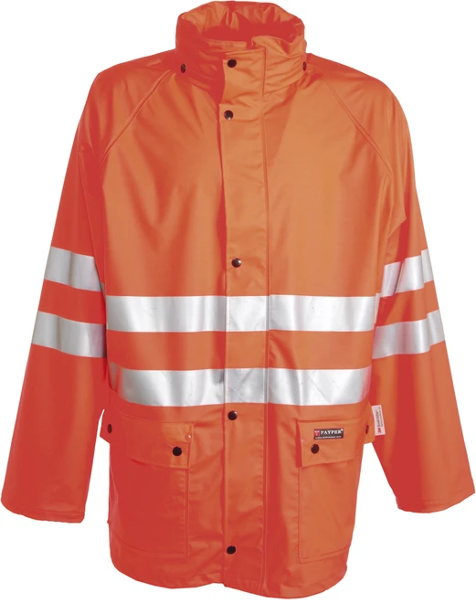 Gut sichtbare Regenjacke mit 3M-Streifen, Raglanärmeln, Innenreißverschluss aus Nylon und Patte mit Druckknöpfen, im Kragen einrollbarer Kapuze, Kordelzug in der Taille, geradem Ärmelabschluss mit darunter liegendem elastischem Ärmelbündchen, zwei Blasebalgtaschen mit Patte, warmversiegelten Streifen und Nähten