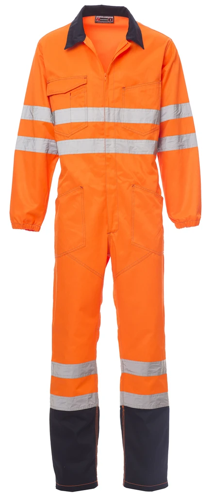 Warnbarer Trainingsanzug mit reflektierenden Streifen, zentraler Reißverschluss mit doppeltem Metallzug, Gummizug in der Taille. Dreifache Nähte im Schritt und im Bein. Zwei große aufgesetzte Taschen, zwei Brusttaschen, eine mit Patte und Hakenring für Ausweishalter, eine Stifttasche, eine Gesäßtasche mit Patte, eine seitliche Maßbandtasche rechts, Bündchen mit Gummibändern