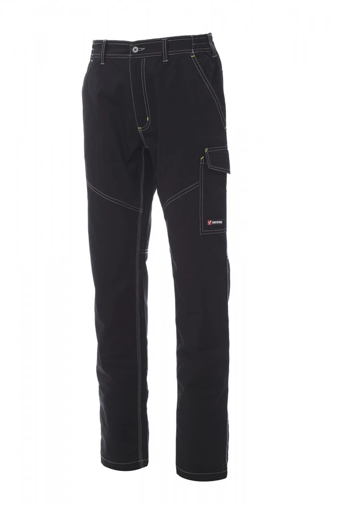 Sommer-Stretchhose mit Einsätzen und Steppnähten in Kontrastfarbe, seitlich dehnbarem Bund und Gürtelschlaufen, Hosenschlitz mit Reißverschluss und Knopf aus Kunststoff, Dreifachnähten im Schritt und am Innenbein, 2 klassisch geschnittenen Vordertaschen, 1 Seitentasche mit LOCK SYSTEM links, 1 Zollstocktasche rechts, 1 offenen Gesäßtasche mit doppeltem Sicherheits-Reflexstreifen und 1 Gesäßtasche mit Patte