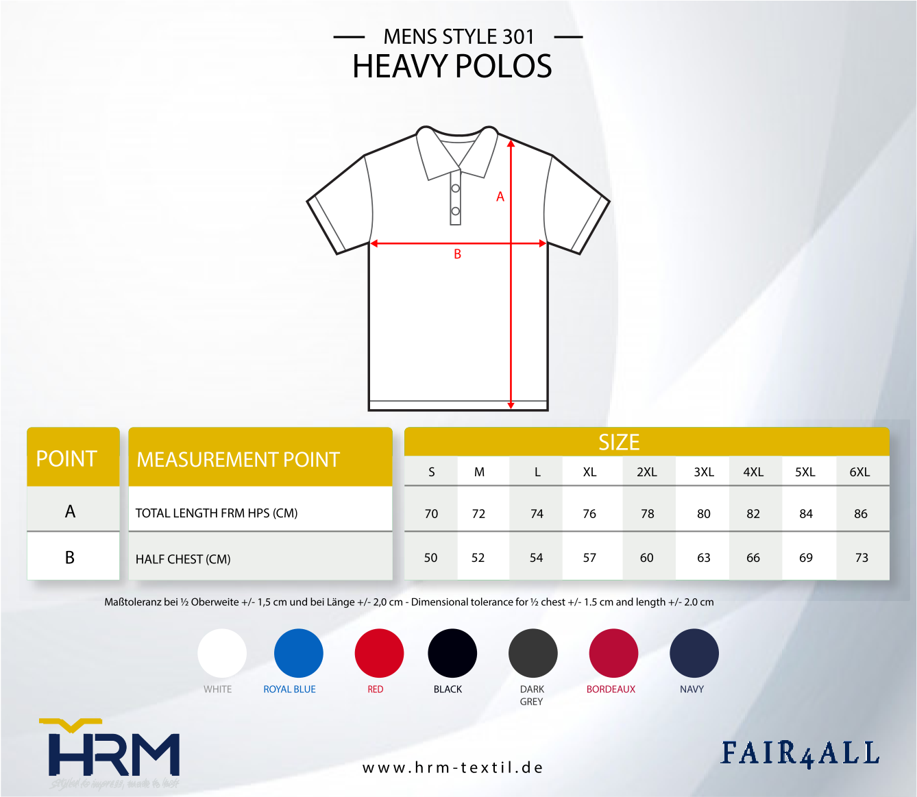 Unsere HRM Men's Heavy Poloshirts bestehen aus besonders robustem ringgesponnenem Piqué aus 100 % Baumwolle. Sie haben einen angenehmen modischen Schnitt und ein verstärktes Nackenband sowie Kragen- und Ärmelabschlüsse aus 1x1-Rippstrick. Die Ton-in-Ton-3-Knopfleiste verleiht den schweren Poloshirts eine ausgewogene Optik bis ins Detail. Die verstärkten Seitenschlitze und das Schulter-zu-Schulter-Nackenband sorgen für einen tollen Tragekomfort und lange Haltbarkeit. Die Heavy-Poloshirts sind, bis auf das eingewebte Fair4All Flag-Label in der linken Seitennaht, etikettenfrei und durch die Anti-Shrink- und Anti-Pilling-Ausrüstung bis 60°C waschbar und besonders pflegeleicht hohe und regelmäßige Waschzyklen. Sie eignen sich besonders für den extremen Einsatz von Arbeitskleidung im Innen- und Außenbereich.